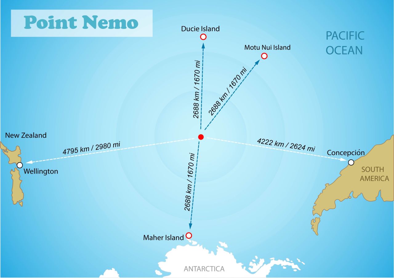 Ponad 260 statków kosmicznych, w tym rosyjska stacja kosmiczna „Mir” oraz elementy związane z poprzednikami Międzynarodowej Stacji Kosmicznej (ISS), spoczywa na dnie oceanu na głębokości około 4000 metrów. Dlaczego właśnie tutaj? Odległość tego miejsca gwarantuje minimalne zagrożenie dla ludności lub ruchliwych szlaków żeglugowych.
