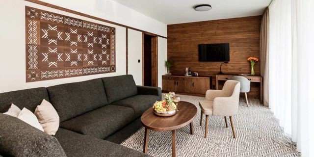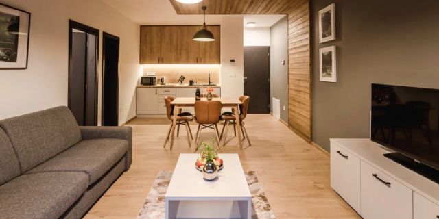 Ośrodek stylowe apartamenty wyposażone w drewniane meble, wygodną sofę i TV sat. Przestronne apartamenty z balkonami zapewniają maksymalny komfort parom, rodzinom z dziećmi czy grupom przyjaciół. Apartamenty są przeznaczone dla 2-7 osób. W większych apartamentach czekają jedna lub dwie sypialnie z podwójnym łóżkiem, salon z wygodną sofą i dużym telewizorem, połączony z jadalnią oraz wyposażony aneks kuchenny. Do dyspozycji są dwie toalety, łazienka z wanną lub prysznicem i luksusowe kosmetyki marki L'Occitane.