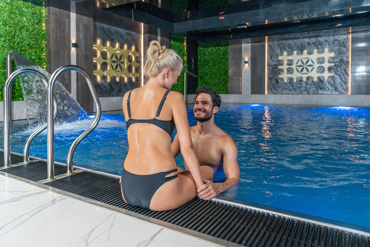 bezpłatny dostęp do przeszklonego basenu, rozbudowanej strefy SPA (jacuzzi, sauny, grota solna), Aqua Aerobik w wybrane dni, seanse saunowe, aromatyczne złote jacuzzi 👑 - wszystko bez dodatkowych opłat