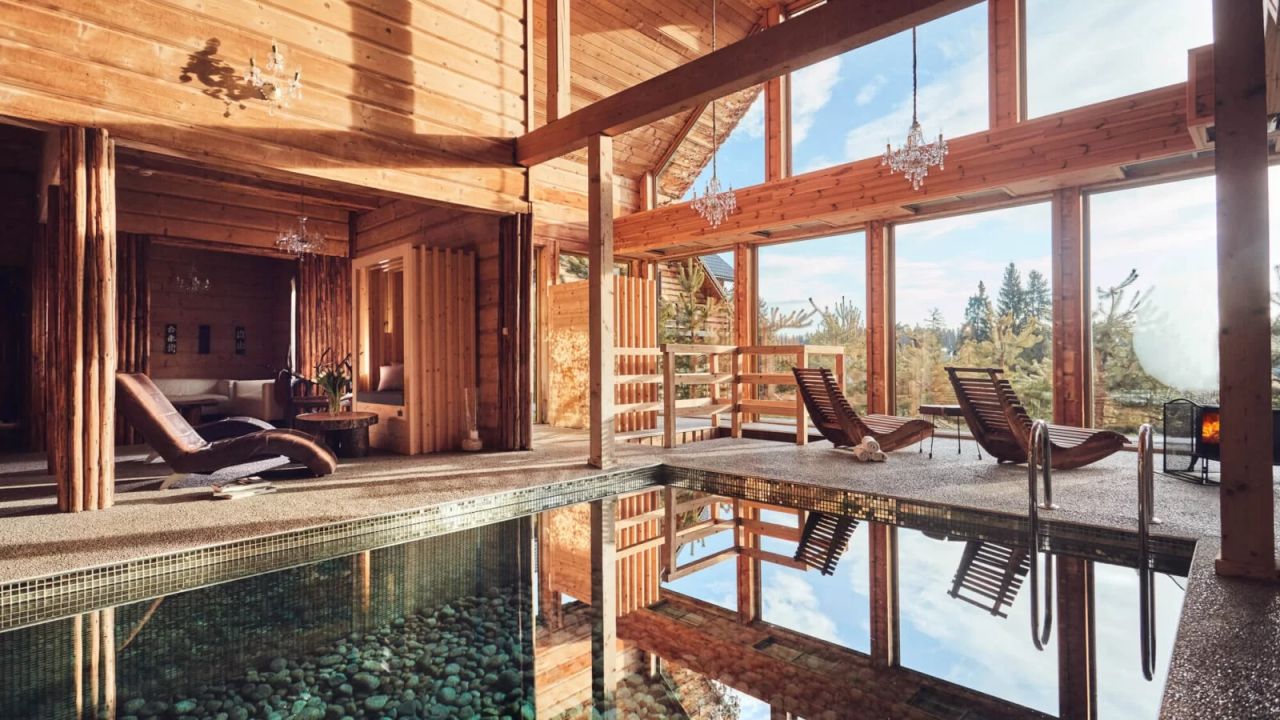 Nowoczesne połączenie ciepłego drewna z oknami na całą ścianę - czy to domku czy hotelowego SPA daje świetny efekt - nowoczesności, ale bez częstego w niej zimna i obcości. Jest swojsko, przytulnie, a jednak nie całkiem klasycznie, no i można z łóżka czy z wody podlądać otaczającą górską naturę - o każdej porze roku i dnia!