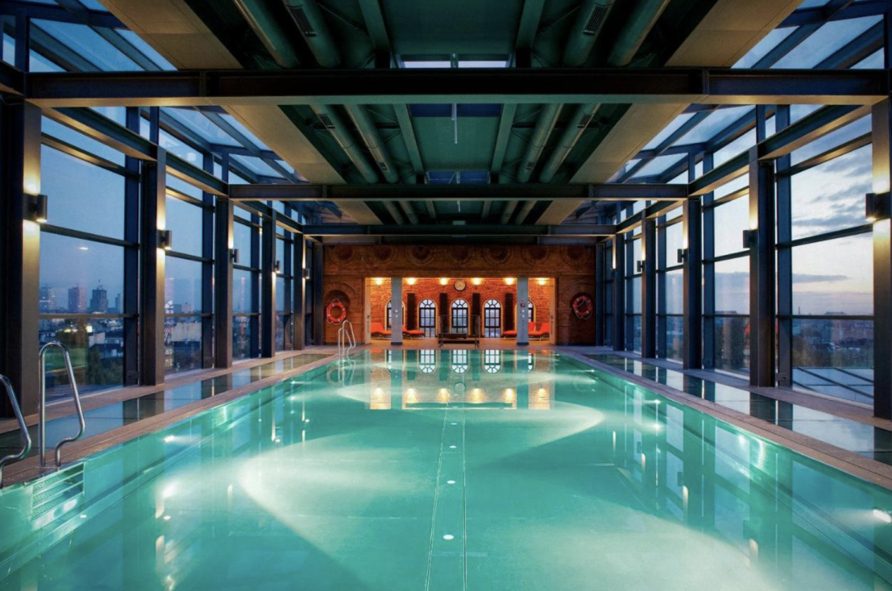 Przeszklony basen, częściowo wystający poza obrys budynku, oferuje spektakularne widoki na panoramę miasta i kompleks Manufaktury. To miejsce, gdzie kiedyś znajdował się zbiornik przeciwpożarowy zabezpieczający fabrykę, dziś zamienione w luksusową strefę relaksu.