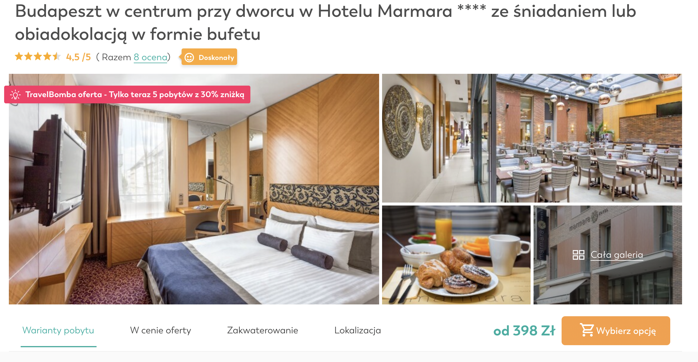 Travelbomby - czyli najlepsze oferty pobytów w promocyjnych cenach w serwisie Travelking. Wśród nich znaleźliśmy perełkę - 4* hotel ze śniadaniami (lub z dwoma posiłkami) w samym centrum Budapesztu w mega cenie.