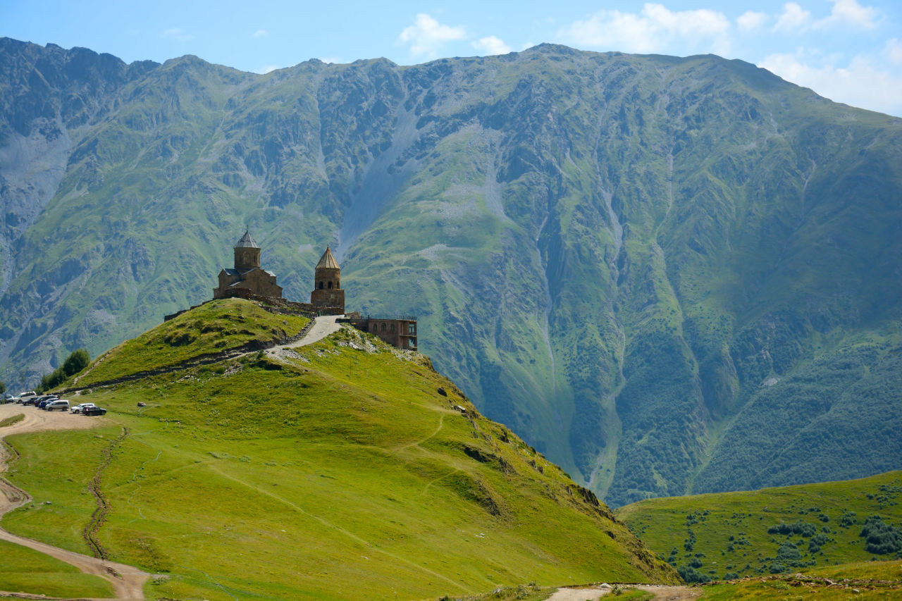 Ponad wioską zobaczycie przede wszystkim pocztówkowy symbol Gruzji - monastyr Gergeti Trinity na tle góry Kazbek.