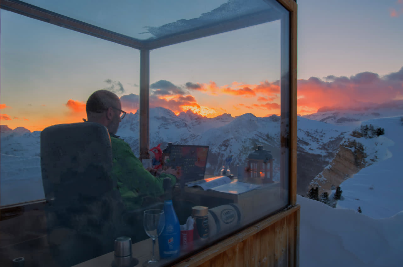 Biuro wcale nie musi wyglądać nudno. Wystarczy, że wynajmiesz tę kabinę z widokiem prosto na Dolomity i Twój home office przeobrazi się w najlepsze miejsce na ziemi.