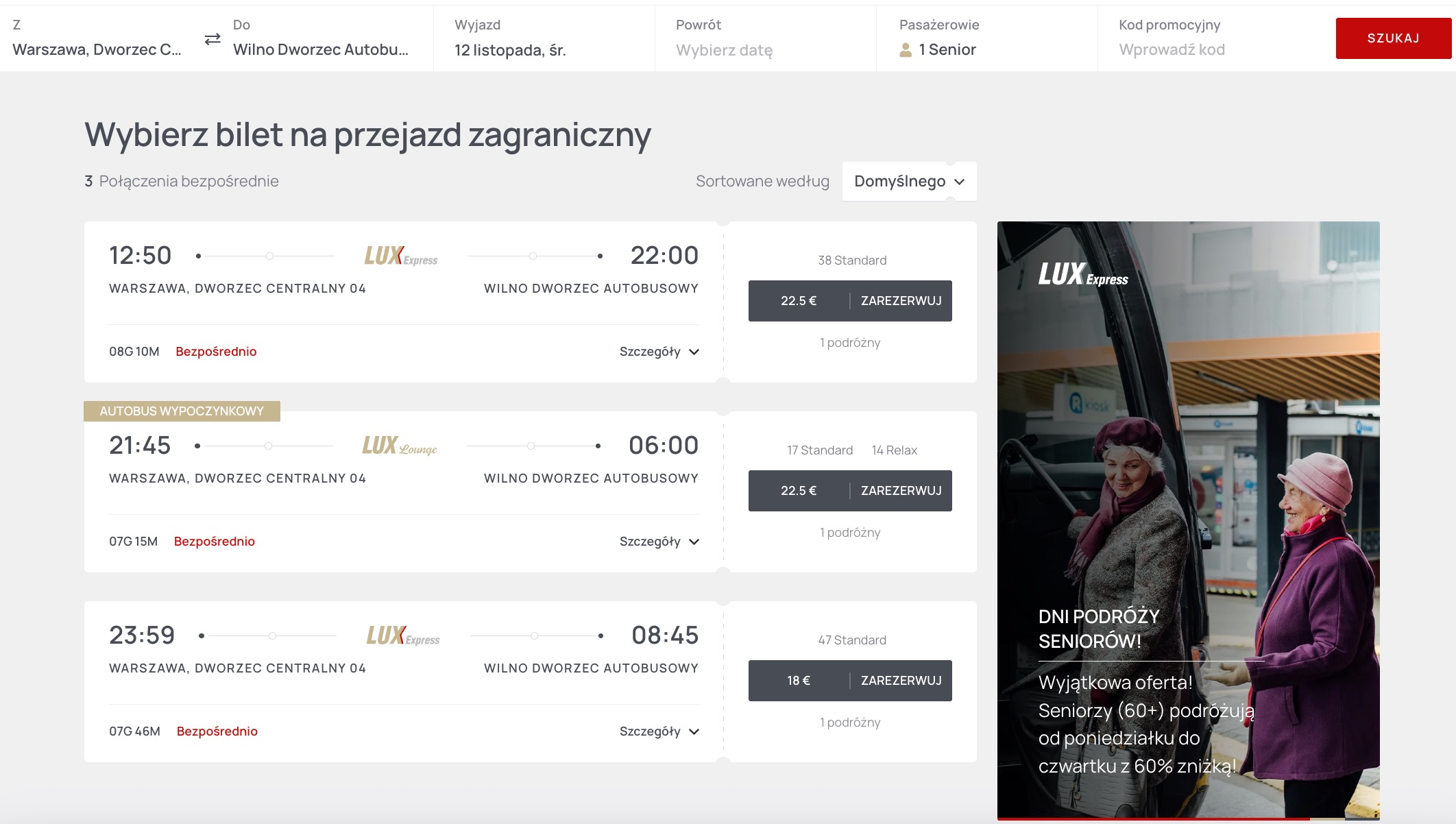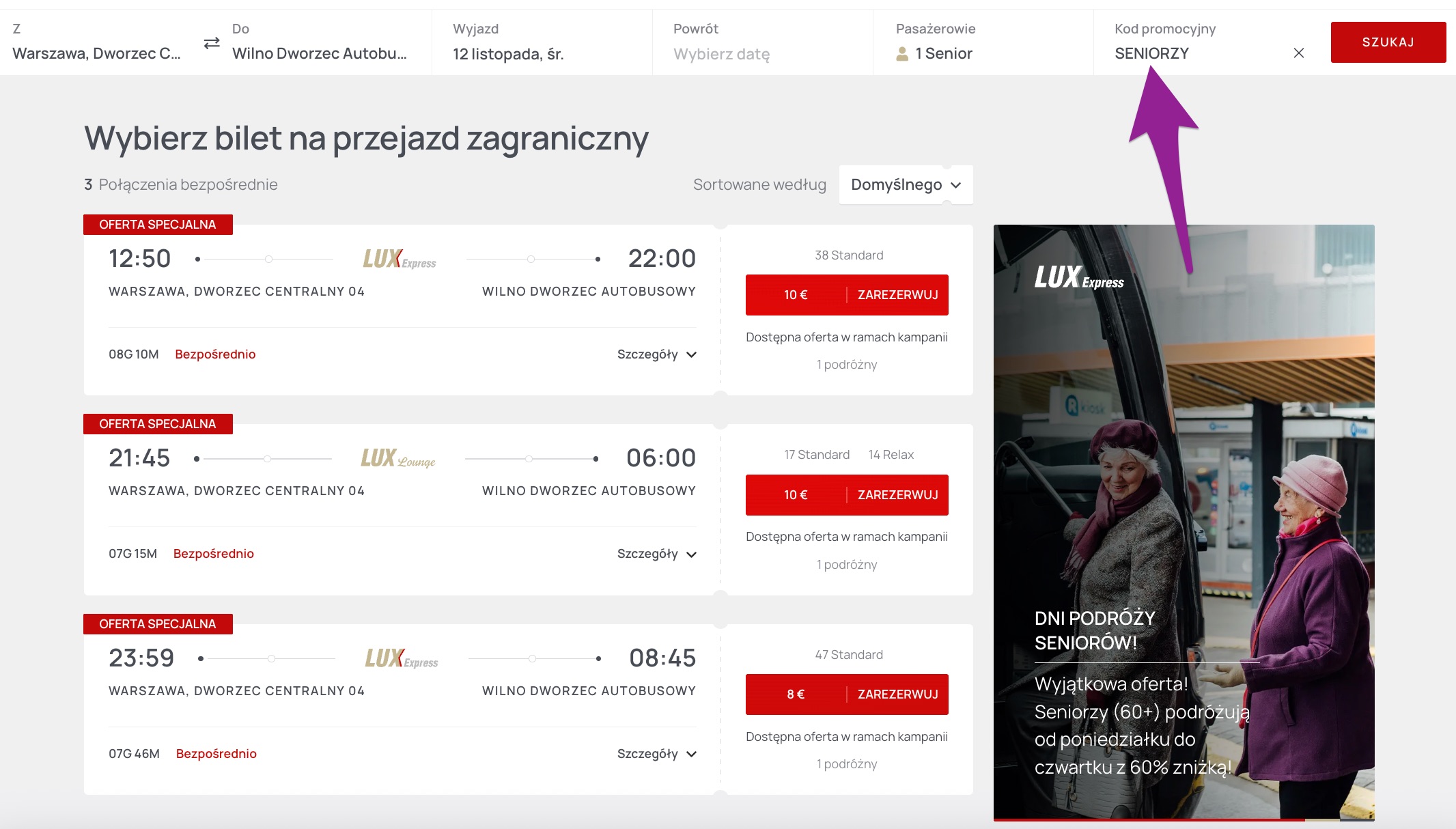 Podczas zakupu biletu na stronie internetowej Lux Express lub w aplikacji mobilnej wpisz wybrane miejsca wyjazdu i docelowe w wyszukiwarce połączeń, wybierz zniżkę „Senior 60+” oraz wpisz kod promocyjny SENIORZY w polu „Kod”. Następnie wybierz dogodny termin podróży