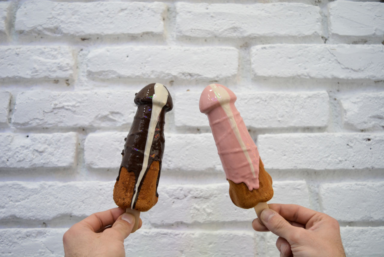 Lody oraz wafle w kształcie fallusa usadowione są wygodnie na patyku, żeby można je wziąć ze sobą na spacer i delektować się nimi podczas przechadzki.